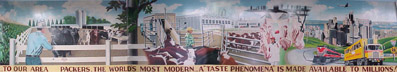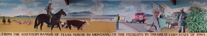 Native artist Cam Ross (1921-1998), who rose to national prominence through his work on the movie, "Cold Turkey", created these murals which illustrate the commerce of the livestock business. The sale barn was important to the local farmer.